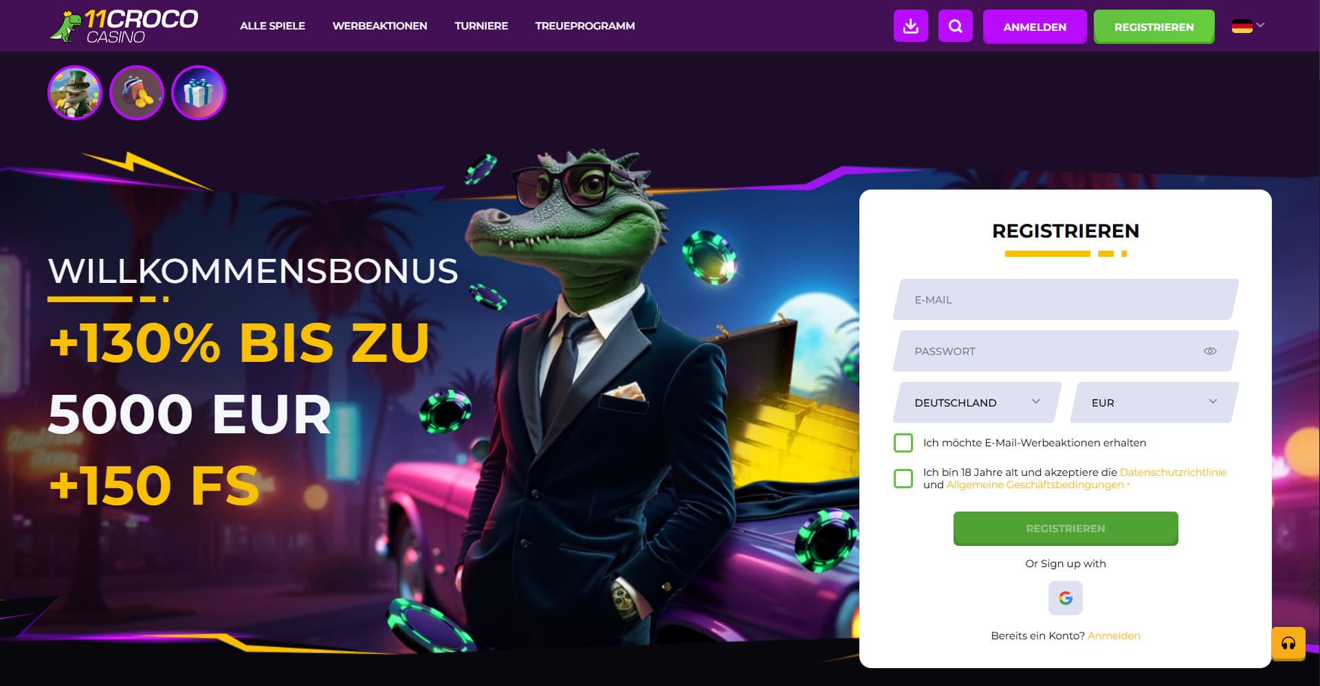 - Willkommensbonus 130% bis zu 5000 EUR + 150 Freispiele im 11 Croco