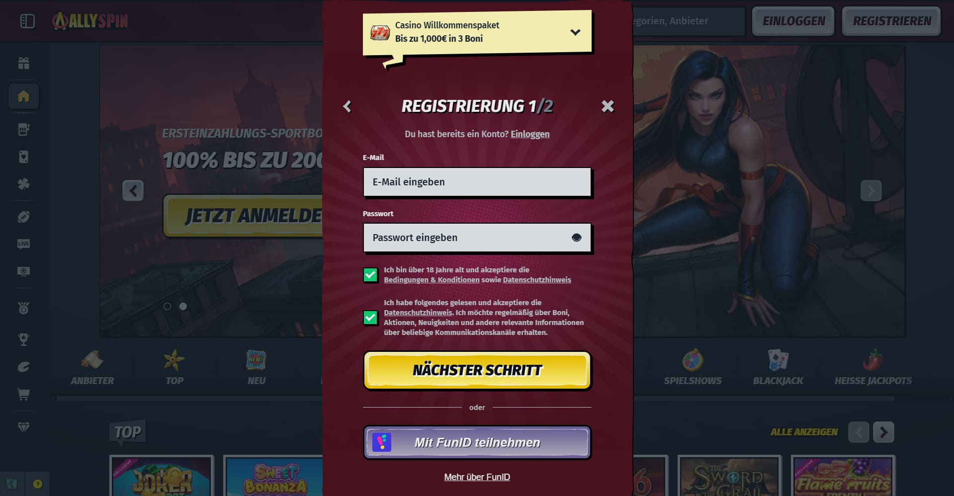 - Willkommenspaket Bis zu 1,000€ in 3 Boni im Allyspin
