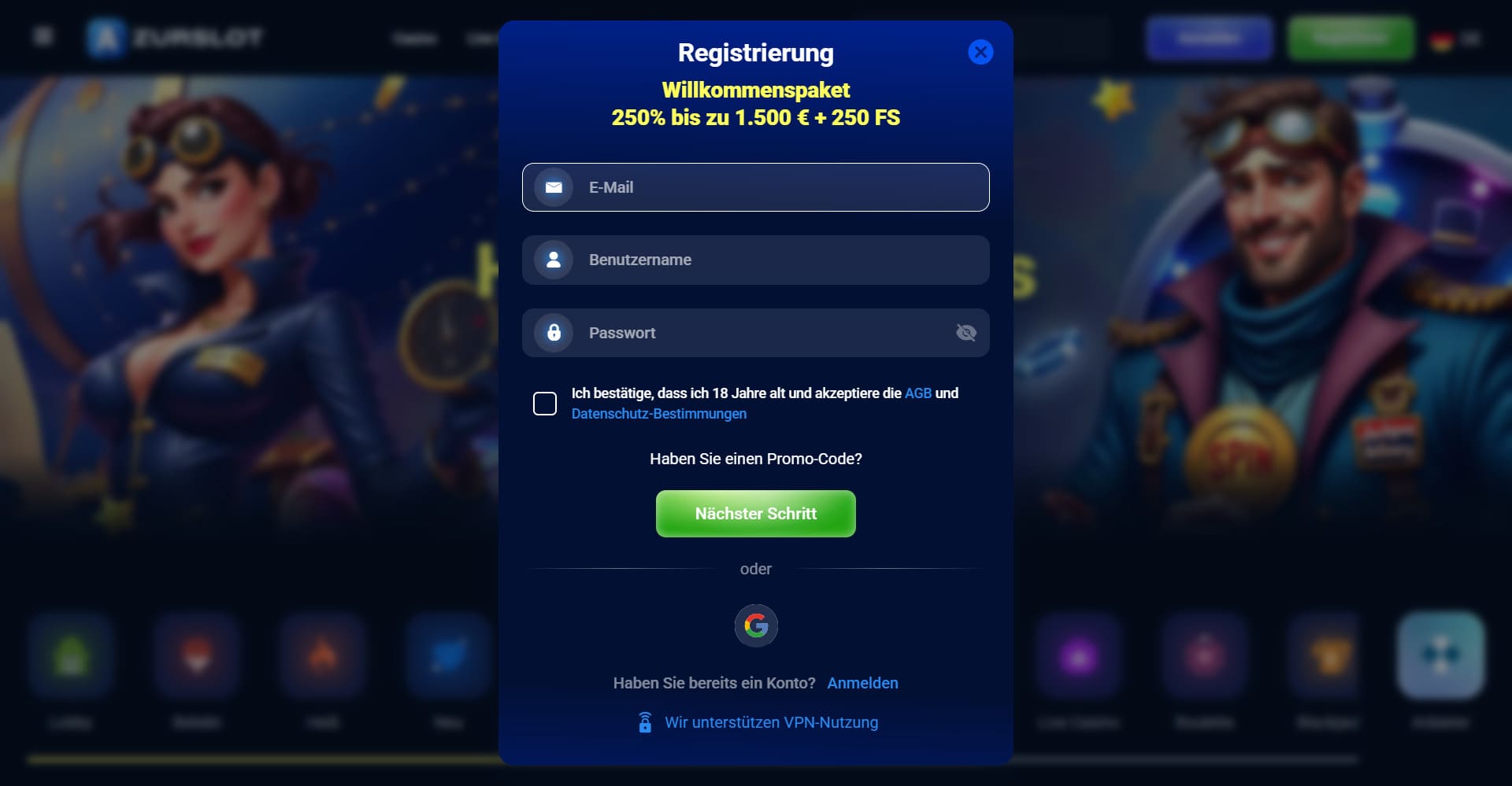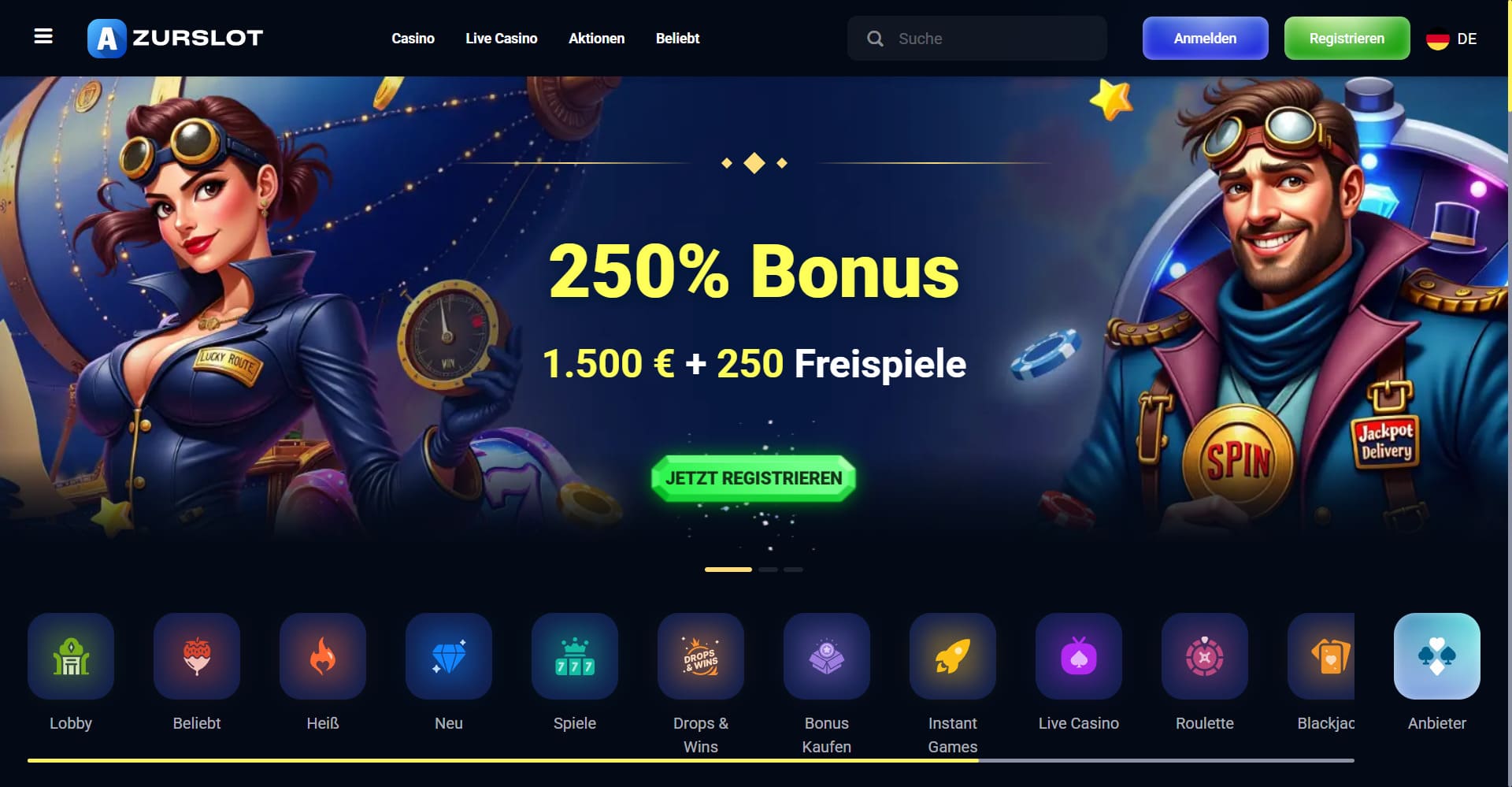 - Willkommenspaket 250% bis zu 1500 EUR + 250 Freispiele im AzurSlot