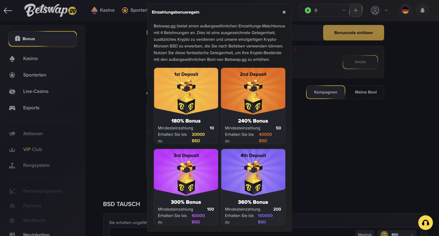 Sie sehen bereits, dass der Bonus mit einer Einzahlung zusammenhängt und dass eine eigene Währung in dem Casino gibt. Da es sich bei dem Betswap.gg Casino um ein Krypto Casino handelt, spielen Sie hier mit der speziellen Währung BSD.