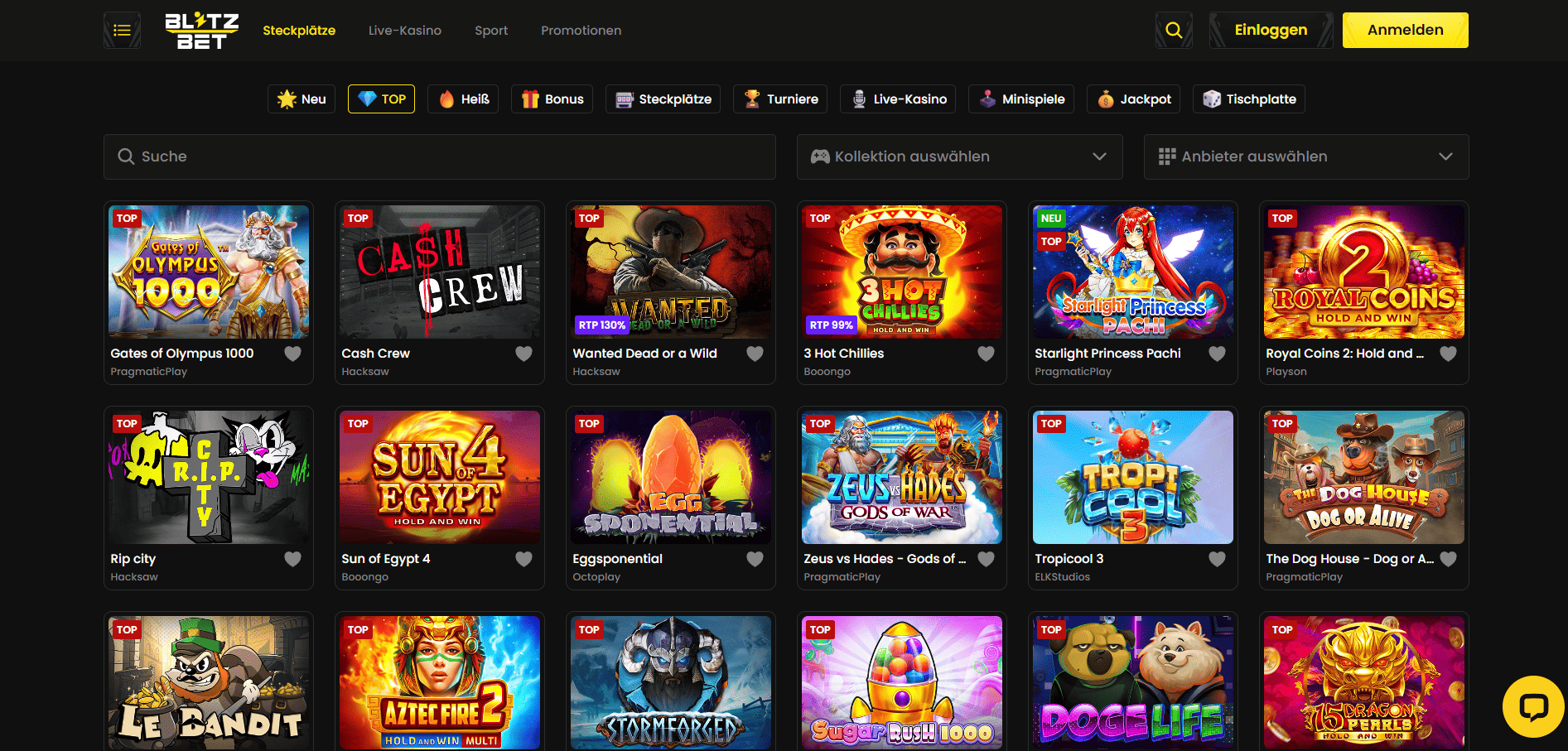 Das Online Casino BlitzBet bietet Ihnen eine bunte Auswahl aus über 4.000 Casino Spielen. Darunter befinden sich natürliche beste Online Spielautomaten, aber auch Tischspiele, Jackpot Spiele und Mini Spiele. Es gibt sogar ein umfangreiches Live Casino, in welchem Sie Spiele wie Roulette, Poker und Blackjack spielen können.