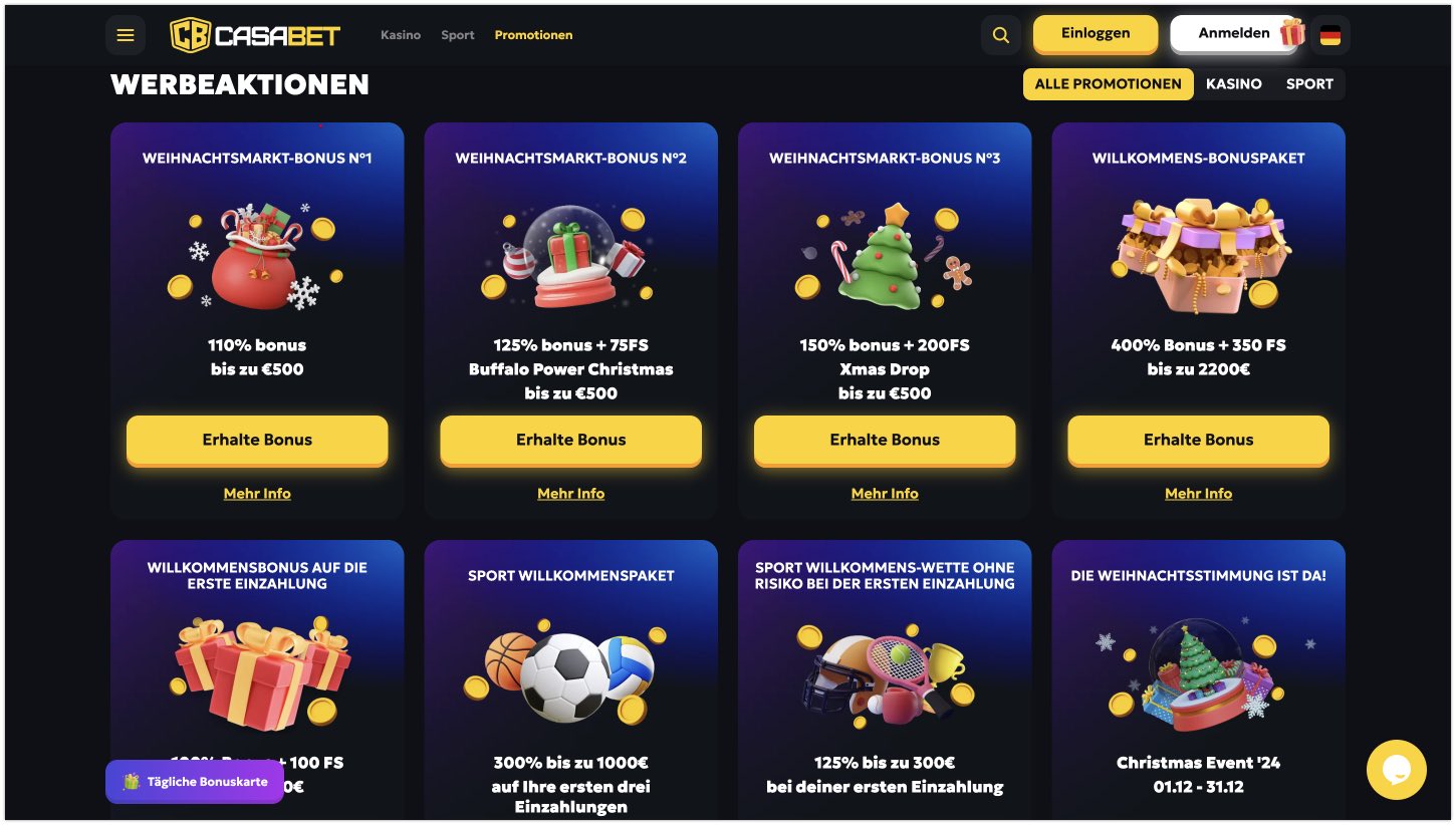 - Willkommenspaket: Im CasaBet Casino erwartet Sie ein Willkommenspaket von insgesamt bis zu 2.200 € und 350 Freispiele auf fünf Einzahlungsboni verteilt.