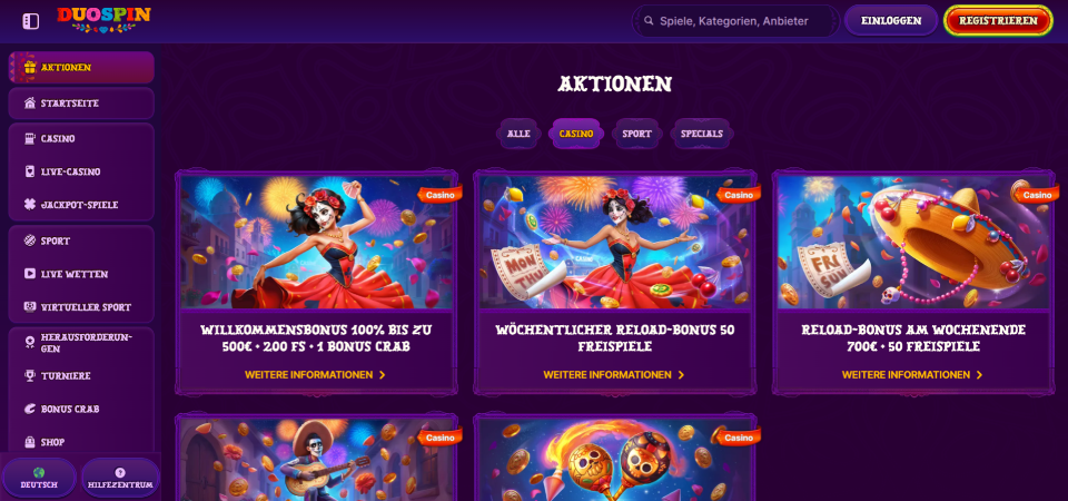 Im DuoSpin Casino können Sie sich auf eine breite Auswahl an Bonusaktionen freuen, denn zum einen gibt es hier zahlreiche klassische Aktionen, zum anderen gibt es auch immer neue DuoSpin Casino Boni 2025 in Form von Herausforderungen.