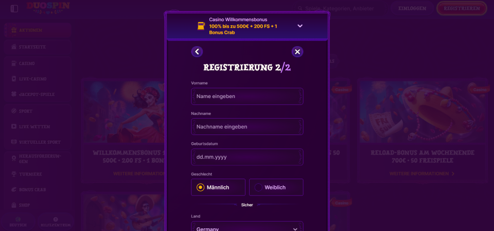 - Willkommensbonus 100% bis zu 500€ + 200 FS + 1 Bonus Crab im DuoSpin