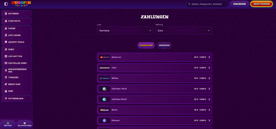 Für Ein- und Auszahlungen stehen Ihnen bei DuoSpin zahlreiche Methoden zur Verfügung. Wenn Sie also mit Echtgeld im DuoSpin Casino spielen wollen, können Sie aus folgenden Methoden wählen:
