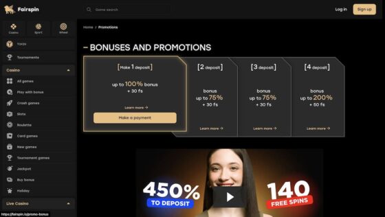 Ein besonderer Blick gilt in einem Casino Test immer den Bonusangeboten und hier kann der FairSpin Casino Bonus absolut überzeugen. Österreicher Neukunden können sich hier auf einen FairSpin Casino Anmeldebonus freuen, der sich über vier Einzahlungen erstreckt. Insgesamt gibt es hier bis zu 450 % auf die Einzahlungen und 140 FairSpin Casino Freispiele.