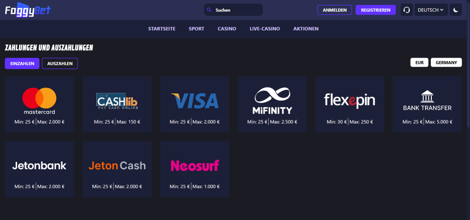 Für die Einzahlung im Online-Casino gibt es eine riesige Auswahl an Optionen, wenn Sie im Foggybet Casino um echtes Geld spielen. Für die Auszahlung haben Sie leider nur vier. Hier sind sie: