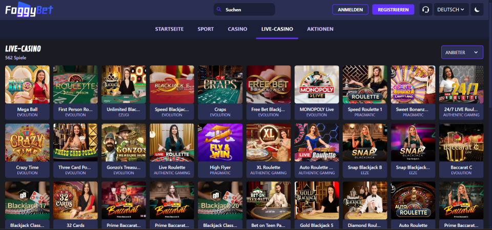 Das Angebot der Spiele lüsst im Foggybet mit über 6.500 Spielen nichts zu wünschen übrig und Sie finden von Spielautomaten über Jackpot und Live-Dealer-Spiele so gut wie alles. Mehr als 25 Anbieter für Casino Software haben die Spiele aufgeschaltet, und zwar sowohl über die Desktop-, als auch über die mobile Version.