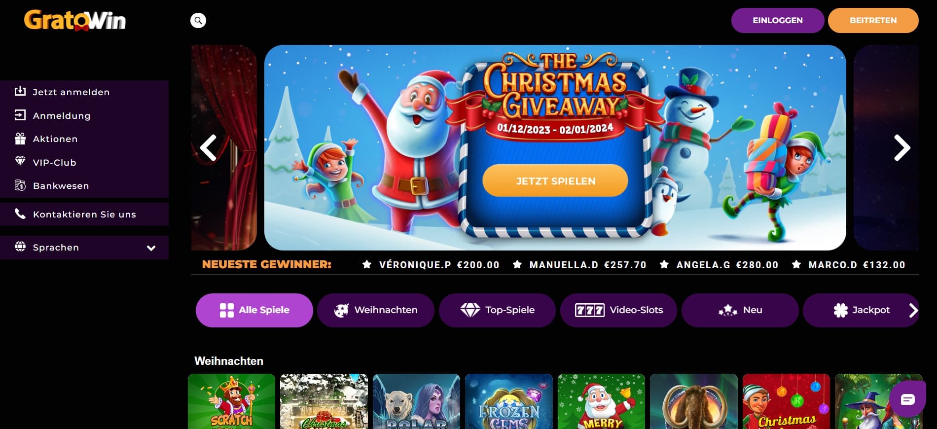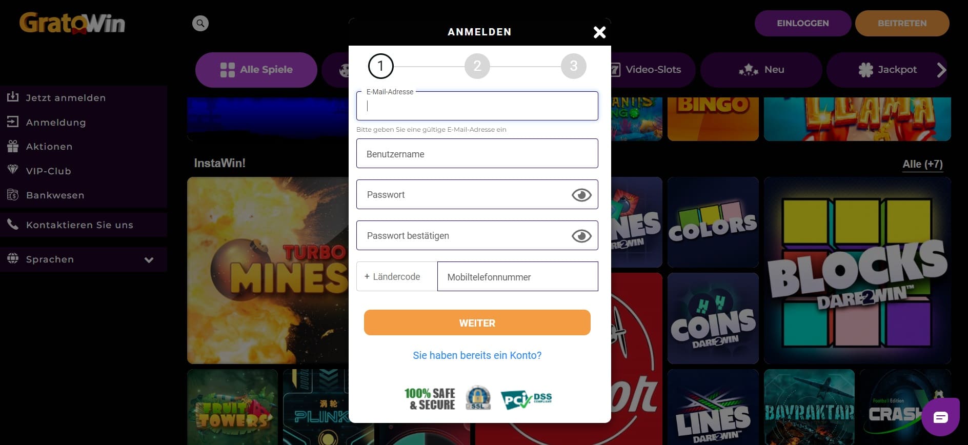 - Wie melde ich mich im Casino an?Sie melden sich im GratoWin Casino an, indem Sie die offizielle Webseite aufrufen und auf den Button “Beitreten” klicken. Hier werden Sie gebeten, Angaben zu Ihrer Person zu machen. Geben Sie diese unbedingt wahrheitsgemäß an, um später Probleme bei der Auswahl zu vermeiden. Die Anmeldung dauert nur wenige Minuten und ist sehr einfach.