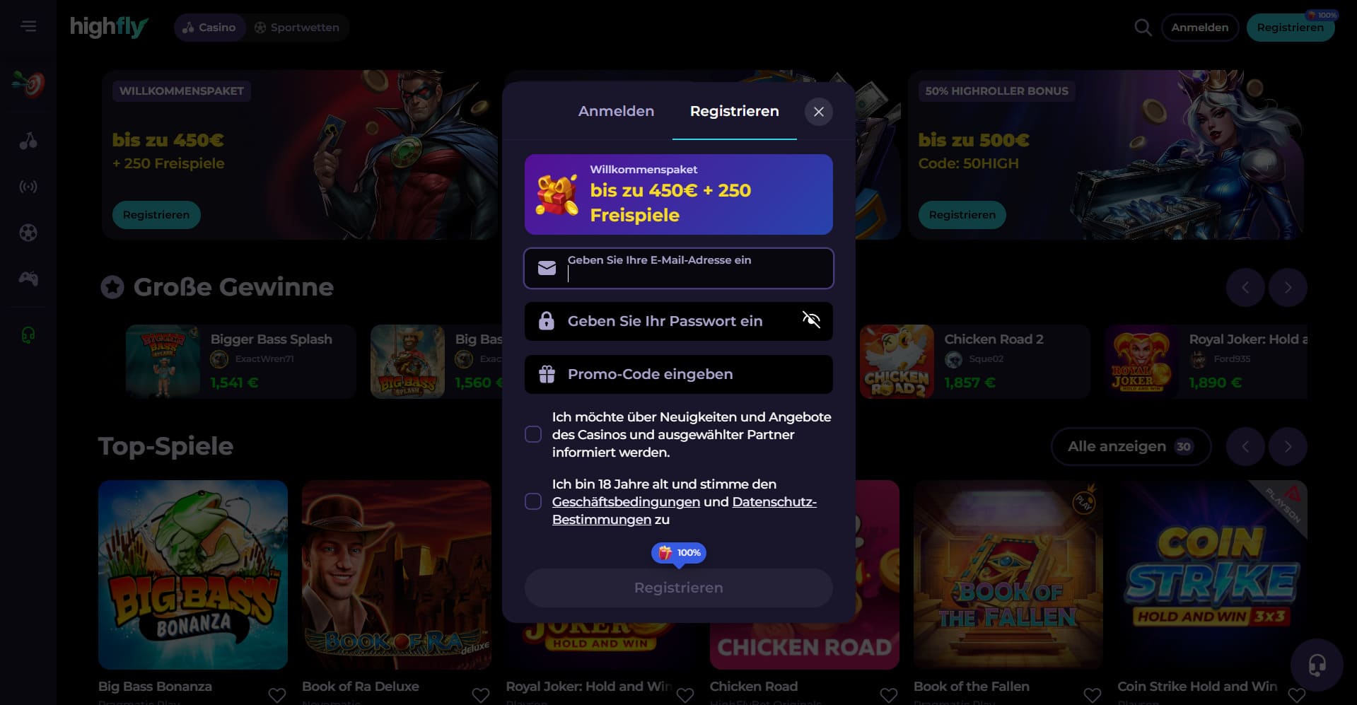 - Willkommenspaket 255% bis zu 1500 EUR + 250 Freispiele im Highflybet