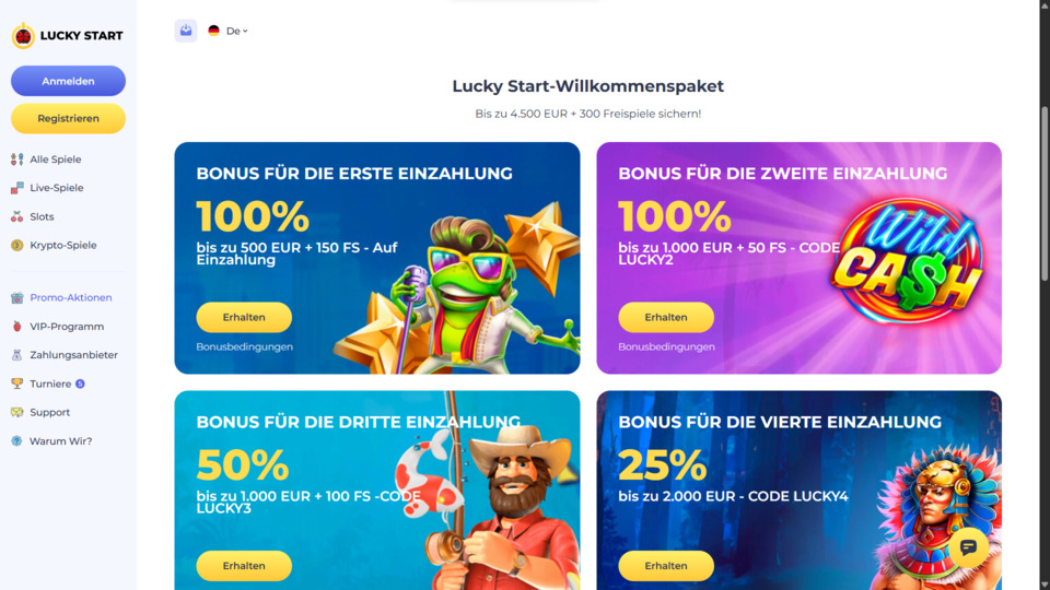 Bevor Sie bei LuckyStart Casino Österreich loslegen, lohnt sich ein Blick auf die Aktionen, denn das Casino setzt stark darauf, sowohl neue als auch bestehende Spielerinnen und Spieler bei Laune zu halten. Die Angebote ändern sich ständig, aber das Grundprinzip bleibt. Einzahlen, Bonus kassieren, und je nach Aktion mehr Spielraum beim Ausprobieren haben. Für den Moment wurden bereits erste Hinweise auf neue Boni im LuckyStart Casino 2025 entdeckt, die offenbar noch großzügiger ausfallen.