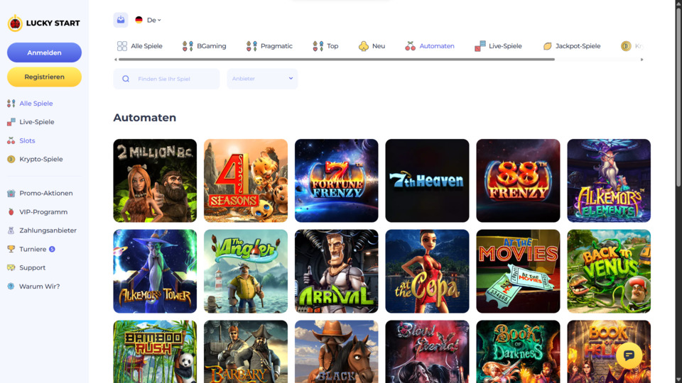LuckyStart Österreich setzt bei seinem Spieleangebot auf Masse und Qualität. Auf der Website sind insgesamt über 7.000Titel gelistet und von einer beachtlichen Auswahl an Software-Entwicklern bereitgestellt. Darunter finden sich bekannte Namen wie Pragmatic Play, NetEnt, Play’n GO oder auch kleinere Studios, die speziell für österreichische Fans von Nischenspielen interessant sind.