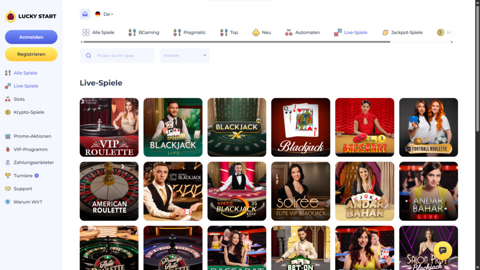 Das Portfolio deckt alle gängigen Kategorien ab, also alltägliche Slots, moderne Video-Slots und Jackpots, Tischspiele wie Roulette oder Blackjack, Live-Casino-Titel sowie Krypto-Spiele, die nur bei LuckyStart Casino verfügbar sind. Die meisten Spiele können Sie übrigens auch erst in Ruhe in der Demo Version ausprobieren, bevor Sie wirklich um echtes Geld im Casino spielen.
