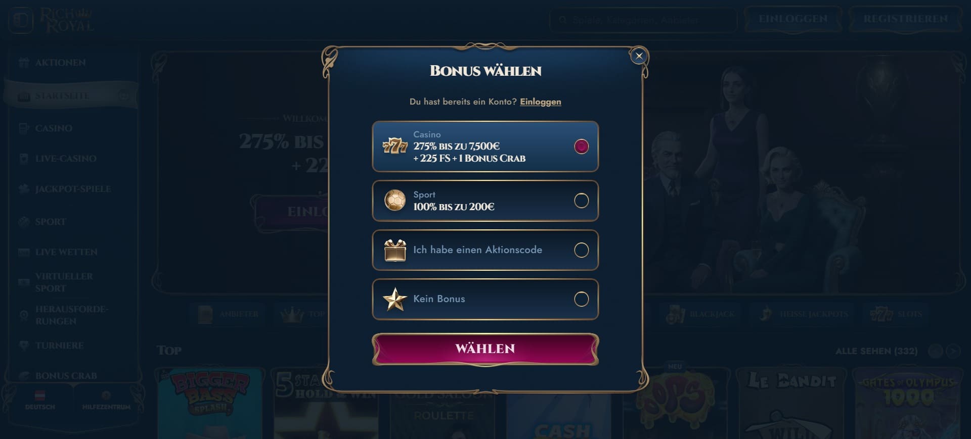 - Willkommenspaket 275% bis zu 7500 EUR + 225 FS + 1 Bonus Crab im Richroyal Casino