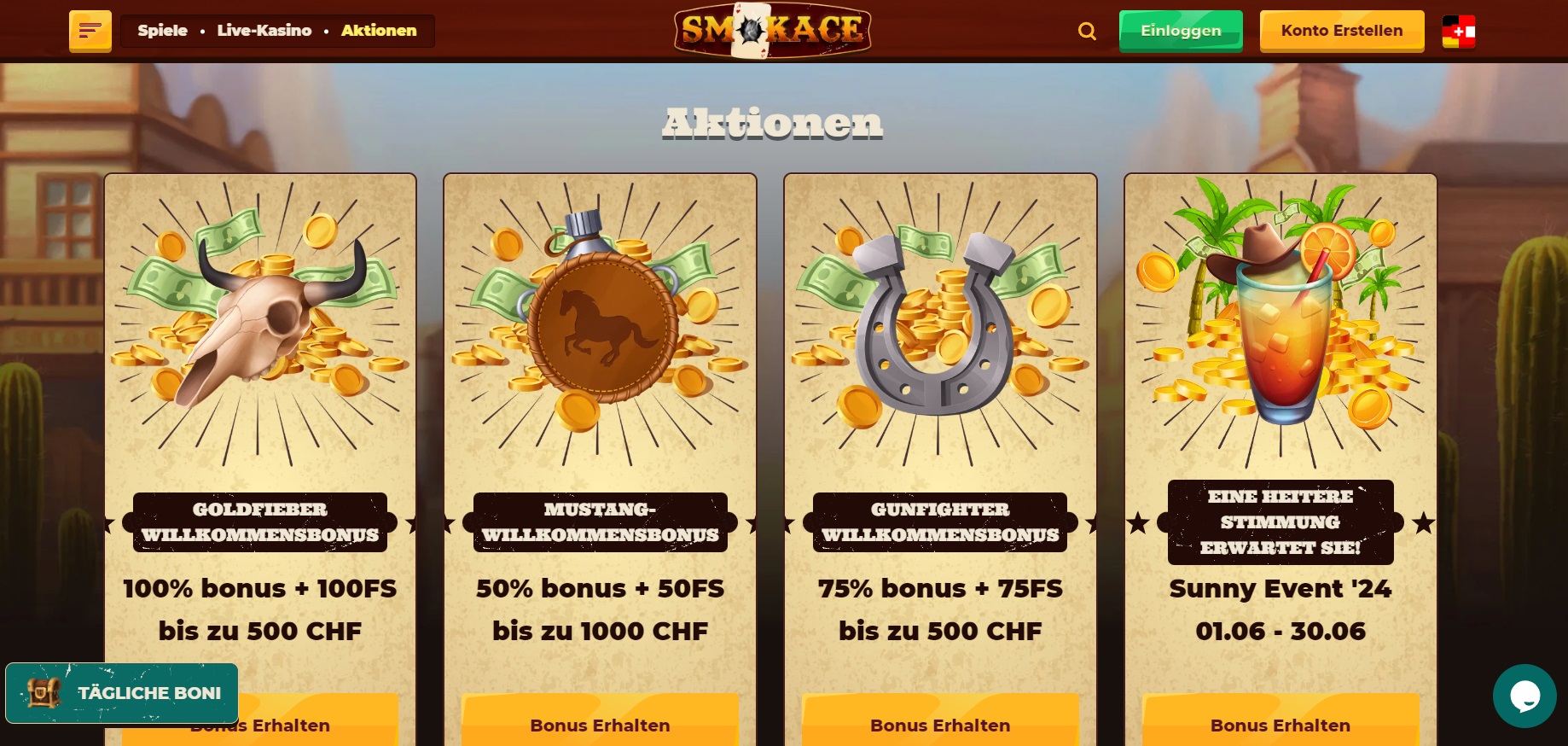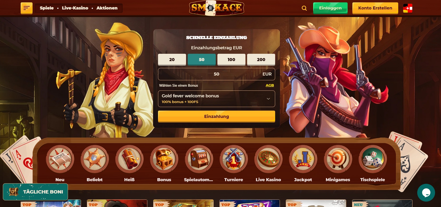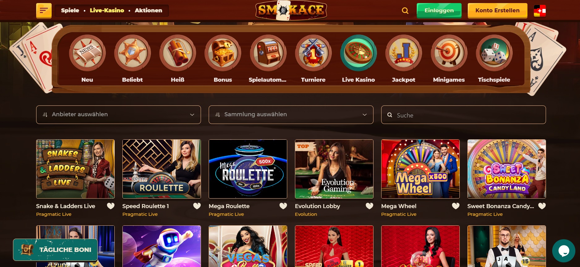 Nachdem Sie ich im Smokace Online Casino registrieren, haben Sie Zugriff auf eine breite Palette an Casino Spielen – insgesamt über 7.500. Darunter befinden sich für Spieler aus Österreich neben Spielautomaten auch Tischspiele wie Roulette, Blackjack und Baccarat. Natürlich darf auch ein Live-Casino nicht fehlen, welches für ein immersives Spiel sorgt.