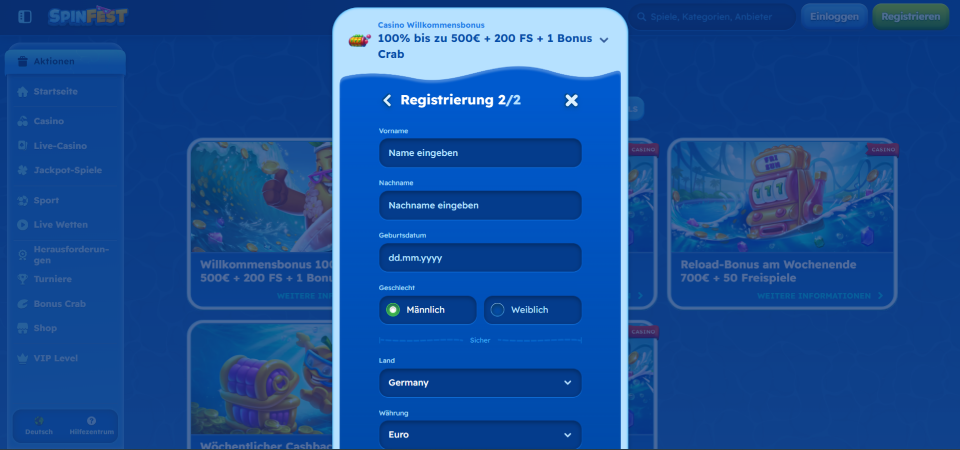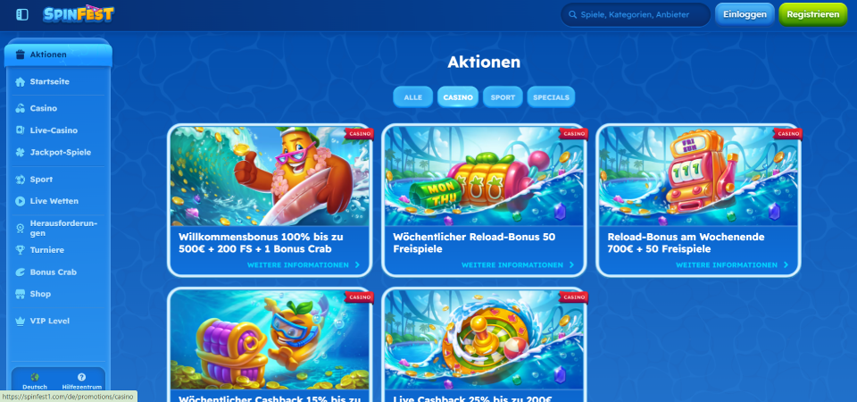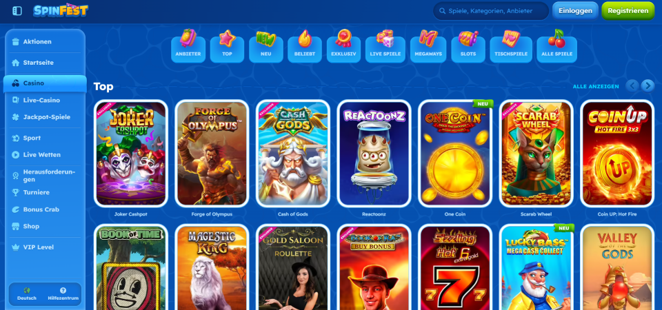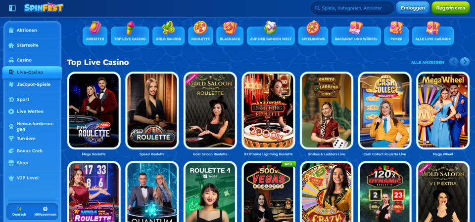 In unserer Spinfest Online Casino Bewertung für Österreich 2025 konnten wir feststellen, dass hier über 10.000 Spiele angeboten werden. Einen Großteil der Spinfest Casino Spiele machen Spielautomaten aus. Aber es gibt auch Spiele wie Roulette und Blackjack, sowie ein umfangreiches Live-Casino.