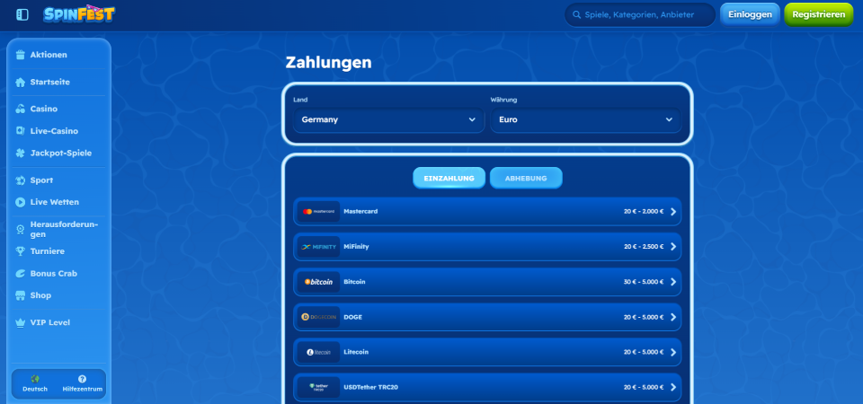Nach Ihrer Anmeldung im Spinfest Casino Online können Sie die erste Einzahlung tätigen. Dazu stehen Ihnen unter anderem folgende Methoden zur Auswahl: