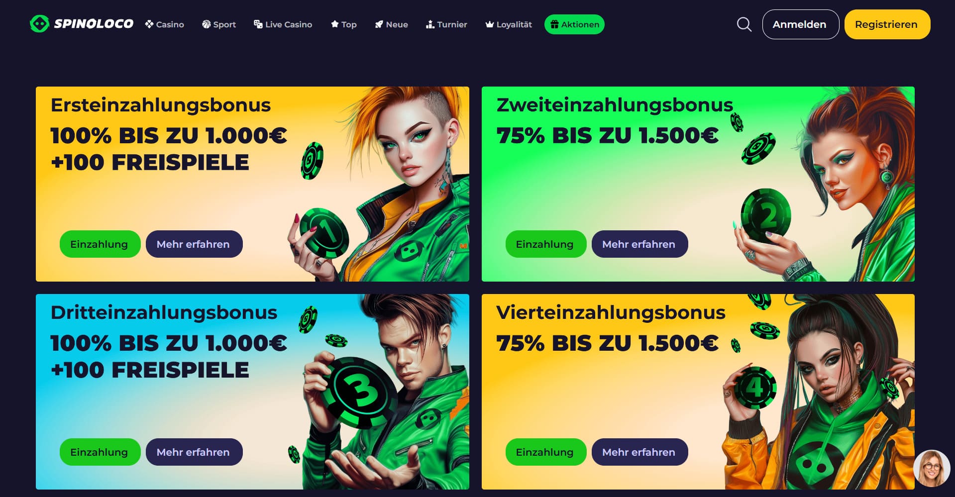 Das Casino hat eine kleine, aber feine Auswahl an neuen Boni im Spinoloco Casino. Wir zeigen Ihnen jetzt, welche das sind und erklären, was dahintersteckt: