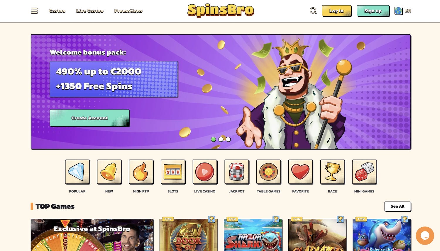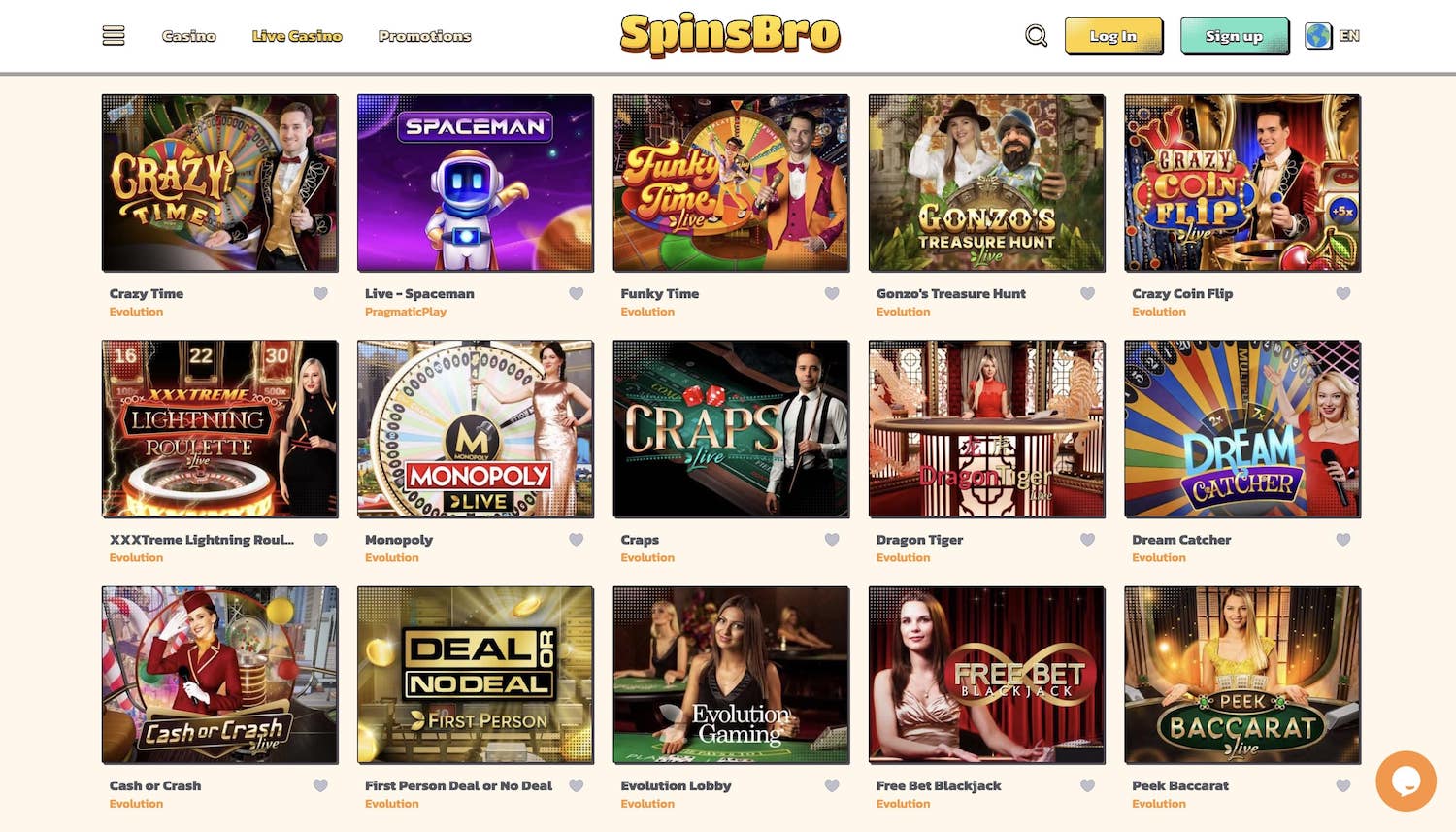 SpinsBro hat ein gigantisches Spieleangebot. Es umfasst nicht nur Tausende Slots von großen Entwicklern wie Pragmatic Play, Play’n GO, Push Gaming, Evolution Gaming und vielen mehr, sondern hat auch einen großen Live-Bereich. Im SpinsBro Live Casino können Sie mit echten Dealern Gameshows erleben, Ihr Glück am Roulette-Tisch versuchen, in eine Partie Blackjack einsteigen und vieles mehr. Darüber hinaus gibt es eine Vielzahl von Turnieren, Minispielen und mehr.