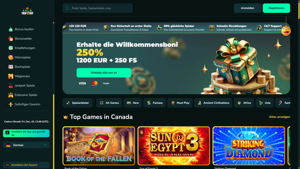 - Trip2vip Casino – Willkommenspaket 100% bis zu 2500 EUR + 250 FS