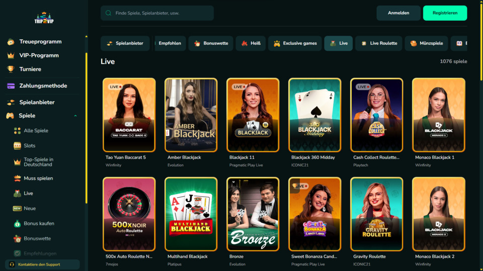 Es gibt im Trip2VIP Casino mehr als 12.800 Casinospiele, wovon 900+ Live-Tische sind. Das liegt unseren Erfahrungen nach im oberen Drittel. Sie finden neben den Spielautomaten auch Slots, wo Sie schnelle Spielrunden spielen, progressive Jackpots und Tischspiele wie Roulette und Blackjack in allen möglichen Versionen.