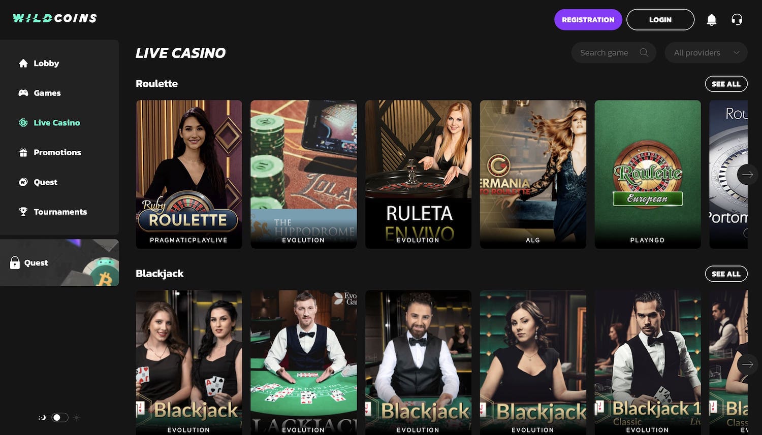WildCoins bietet nicht nur eine Vielzahl von Spielautomaten von Pragmatic Play, Truelab, BGaming, Booming und mehr, sondern auch einen Live-Bereich mit echten Dealern. Im WildCoins Live Casino können Sie beliebte Spiele wie Roulette, Blackjack und mehr mit Kryptowährungen spielen. Insgesamt ist das Spieleangebot sehr ordentlich und vielfältig, so dass für jeden Geschmack etwas dabei ist.
