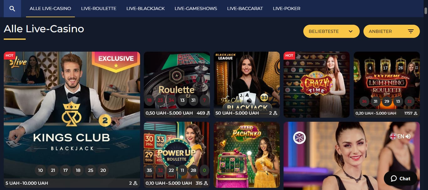 Für Spieler, die das Live-Erlebnis suchen, gibt es eine eindrucksvolle Auswahl an Live-Spielen. Zu den Favoriten zählen Monopoly Big Baller, Crazy Coin Flip, Mega Wheel, Crazy Time und Deal or No Deal. Aber auch Klassiker wie Baccarat und Craps sind live verfügbar. Darüber hinaus ergänzt ein Bereich für virtuelle Sportwetten das umfangreiche Spielangebot.